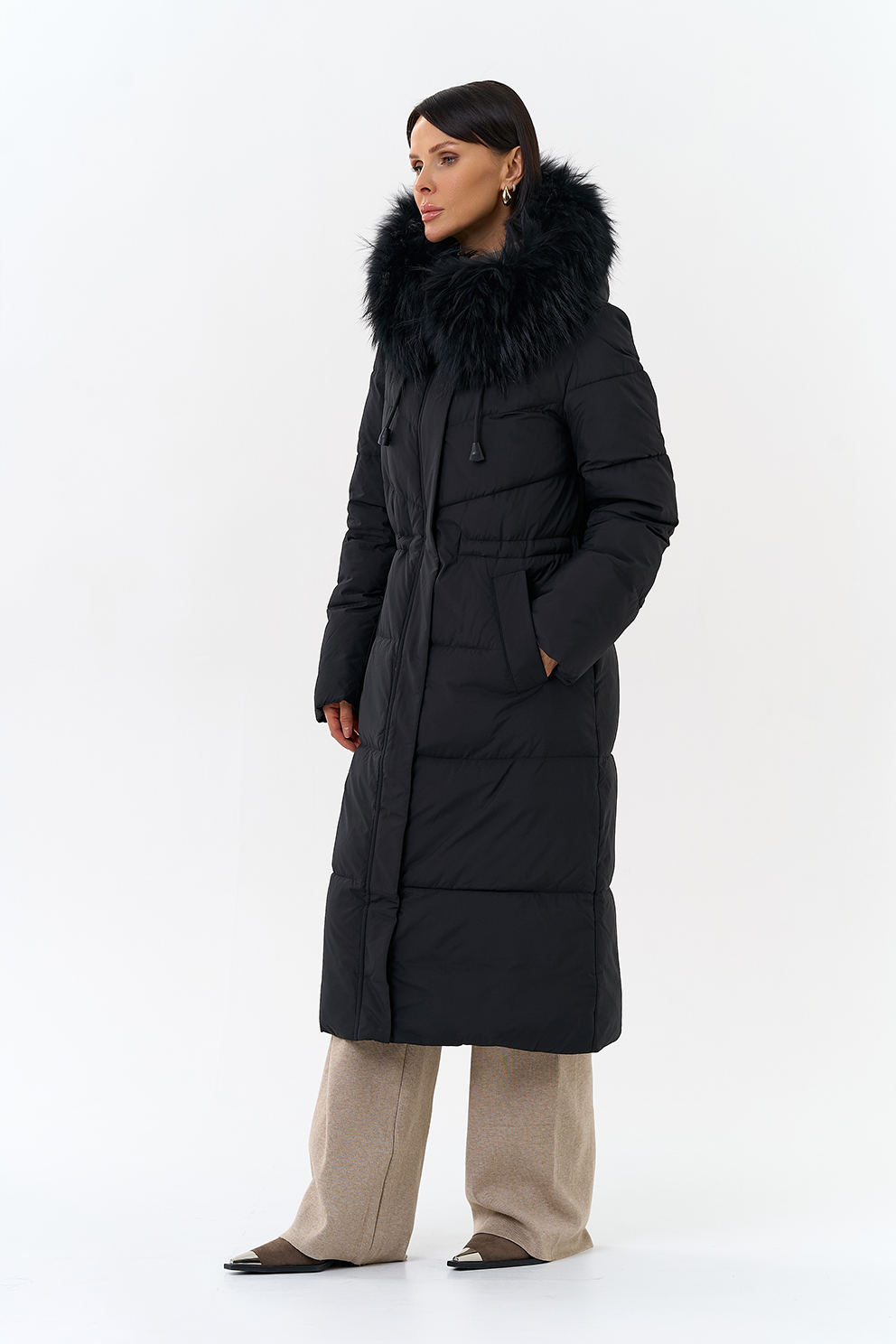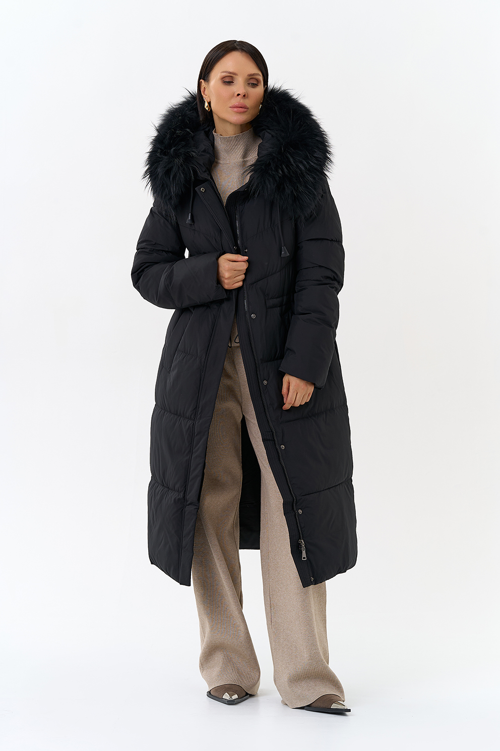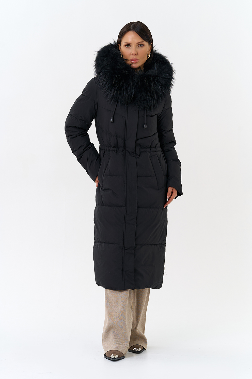 Крой воротника - капюшон, отделка чернобурка