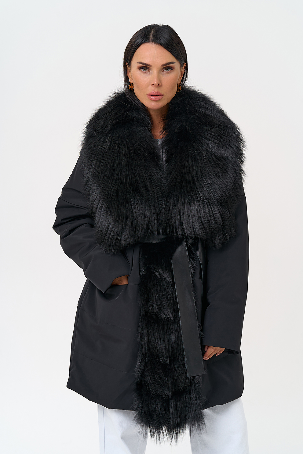 Вид застежки - кнопки, брендированный пояс из натуральной кожи