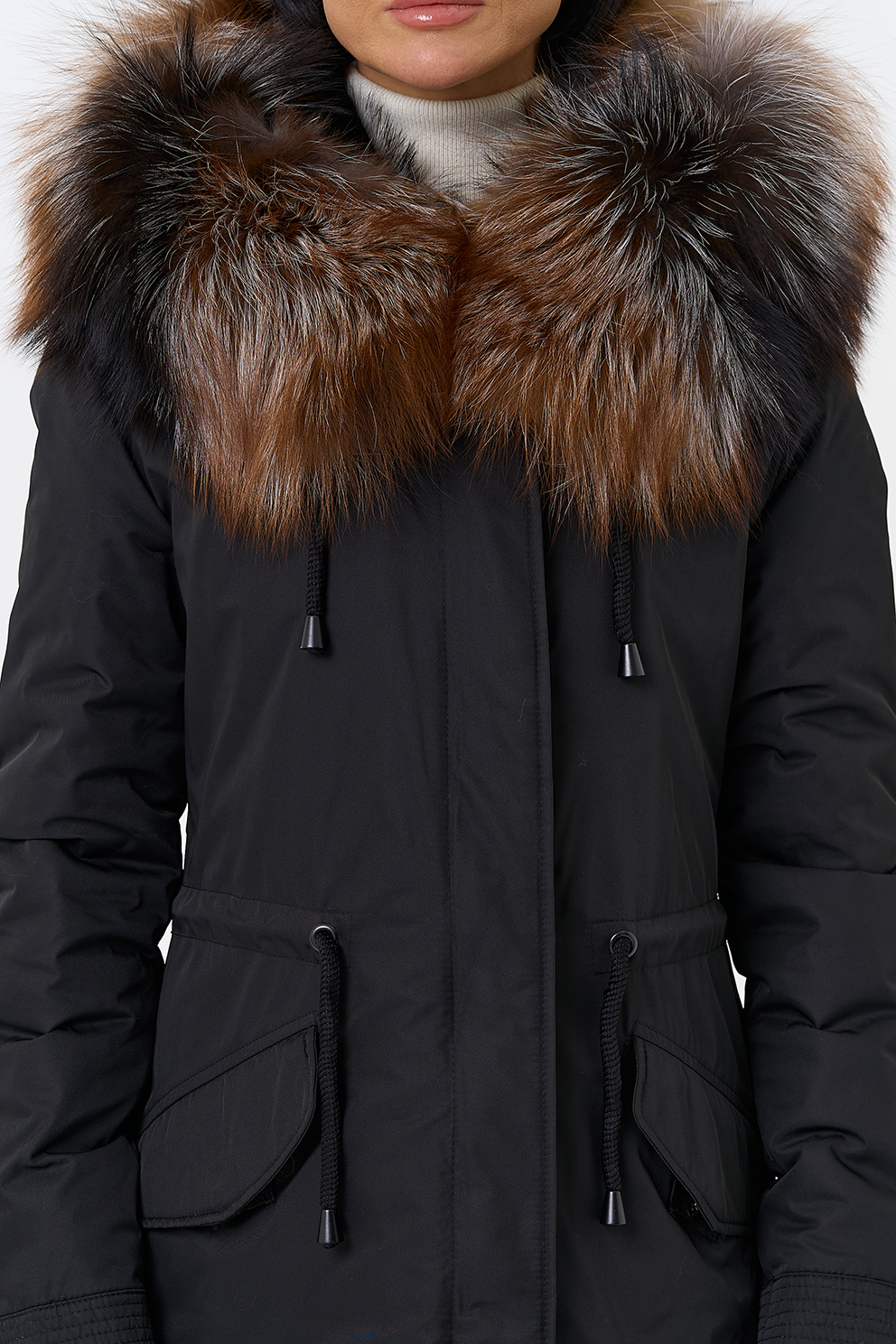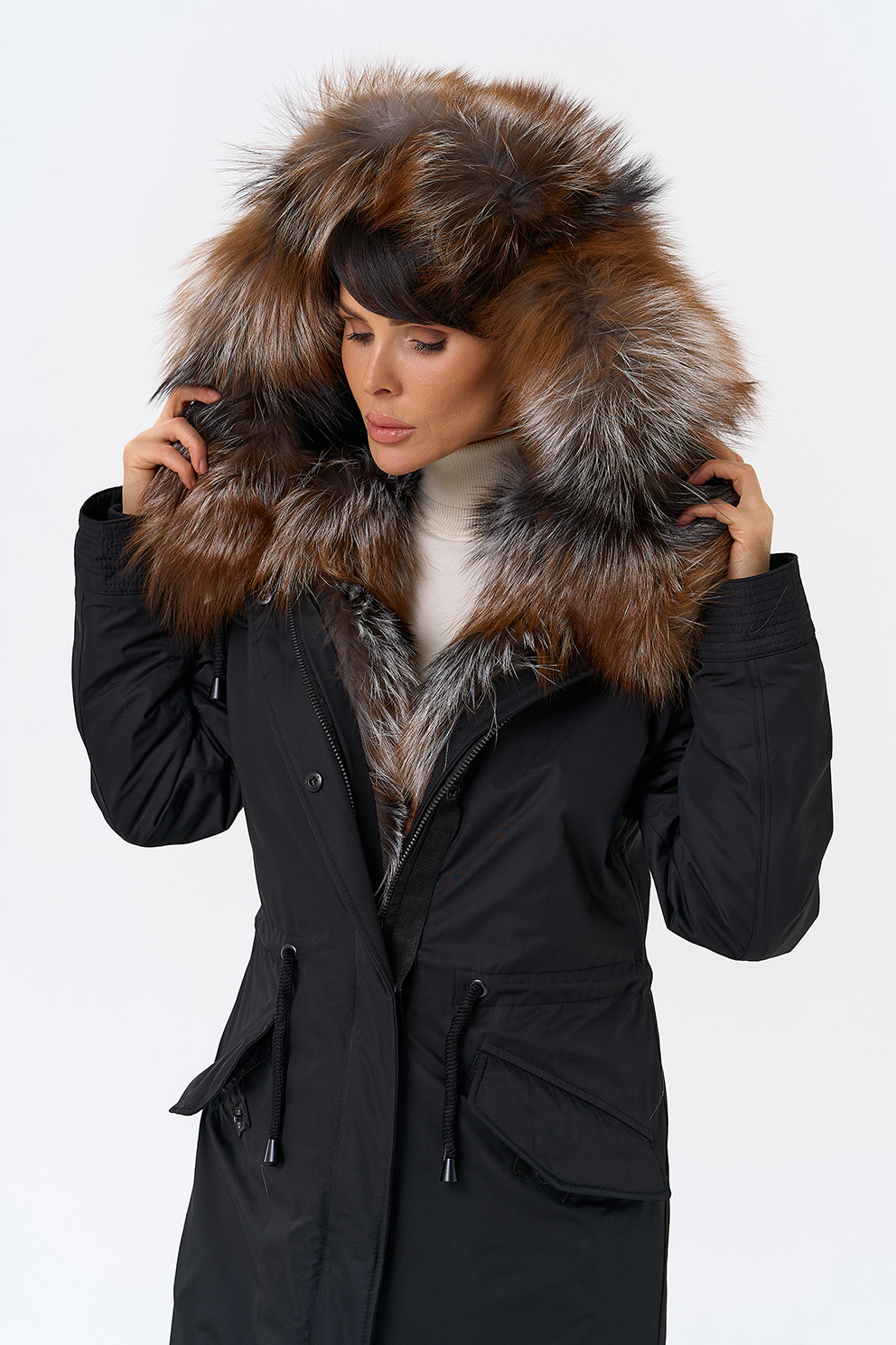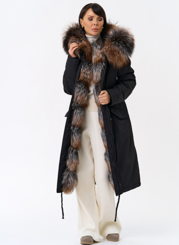 Крой воротника - капюшон, отделка чернобурая лиса Otoban, овчина